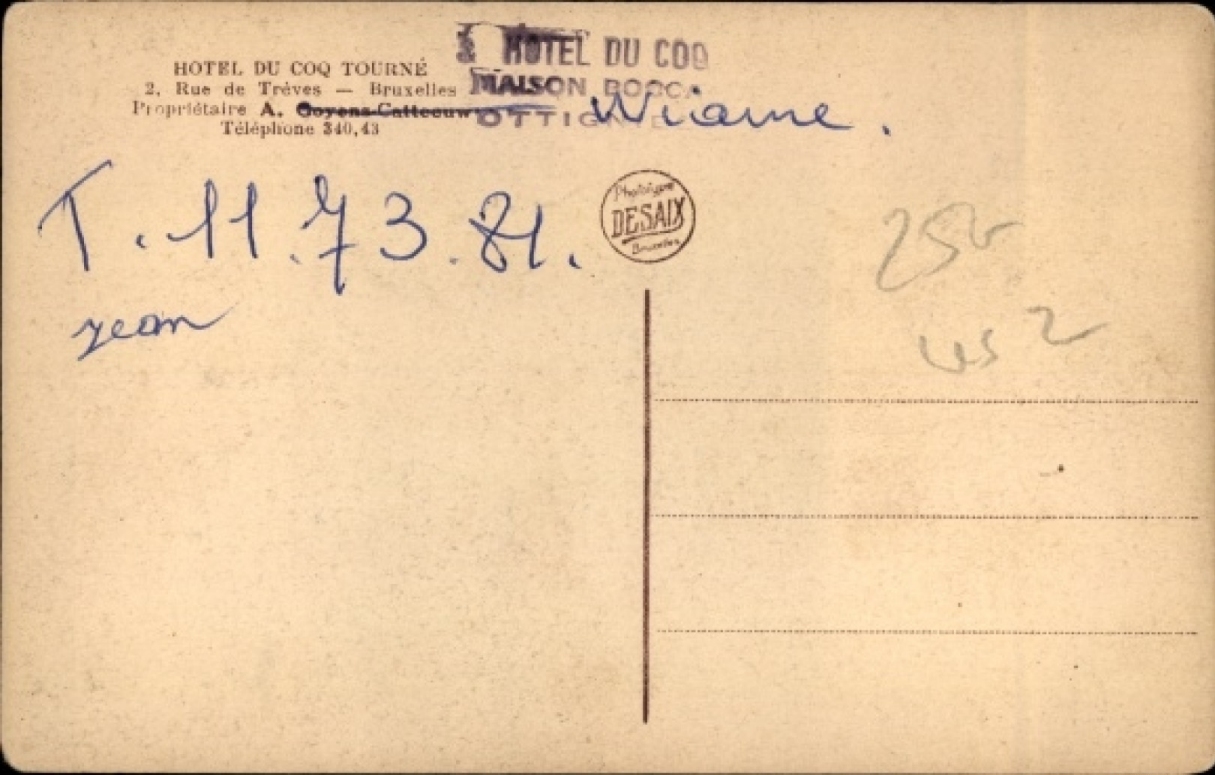 Datation: au verso on trouve le numéro de l'hotel en 5 et 6 chiffres ce qui correspond à une transition qui a eu lieu vers 1934-1935.