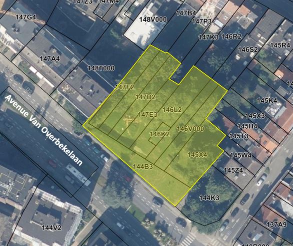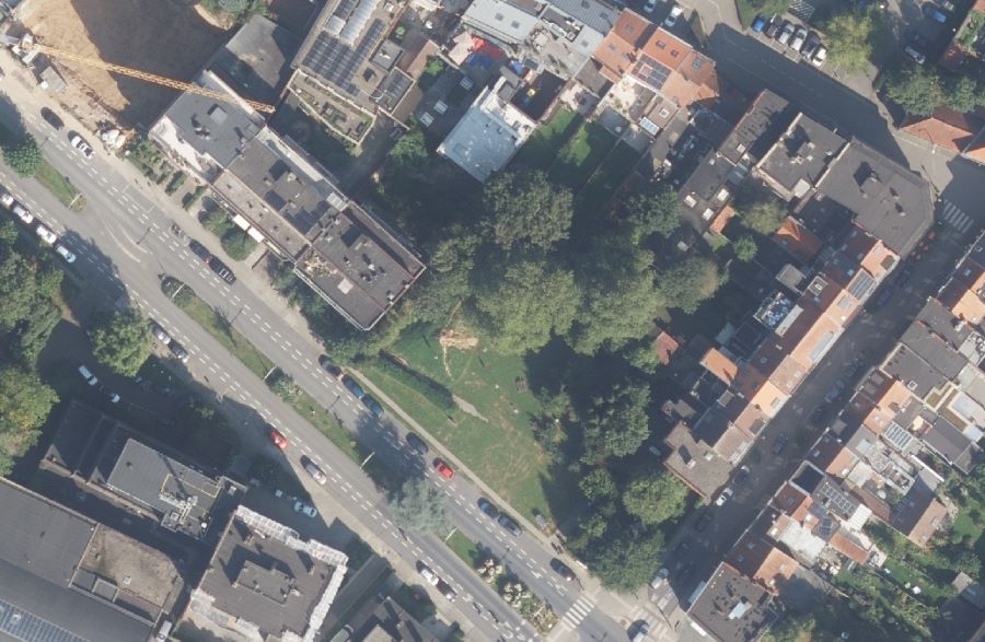 Avenue van Overbeke sur l'ancien tronçon de la rue de Dapper (disparue). Vue vers le Nord-Ouest. Au lieu de la prairie figuraient deux maisons hautes et deux maisons basses perpendiculaires à la rue.