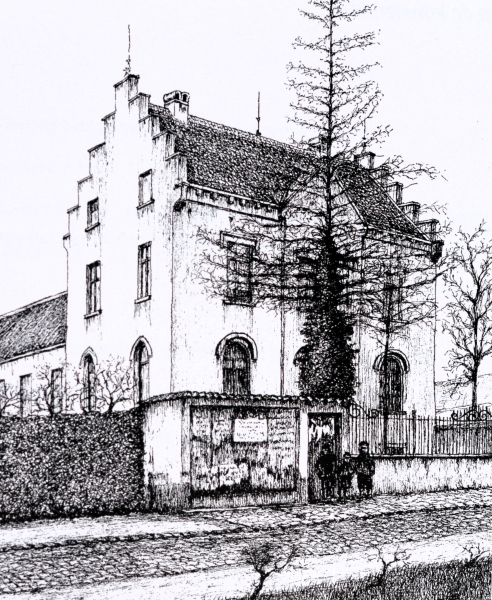 Photo vers le Sud à partir de l'autre côté de la rue de l'Eglise Saint-Martin. On distingue encore une enceinte supprimée plus tard ainsi qu'une aubette, arrêt de bus. Un mur rejoignant un bâtiment annexe, futur bureau de police ayant subsisté jusqu'à aujourd'hui, n'est pas encore présent. Une crèche de style moderne remplace actuellement ce bâtiment.