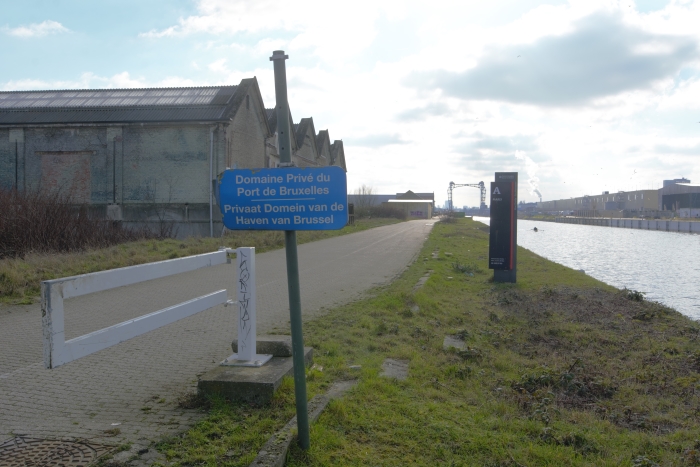 Ce bâtiment qui surplombe la Senne passe de la Région flamande à l'avant (où il est gravé "IMPORTATION" sur une porte et "EXPORTATION" sur l'autre) à la région bruxelloise côté du canal.